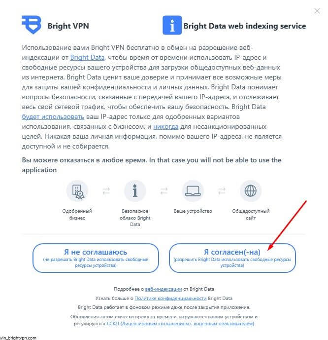 Подтвердите согласие на использование вашего IP-адреса для загрузки общедоступных веб-данных (благодаря этому ВПН предоставляется бесплатно).